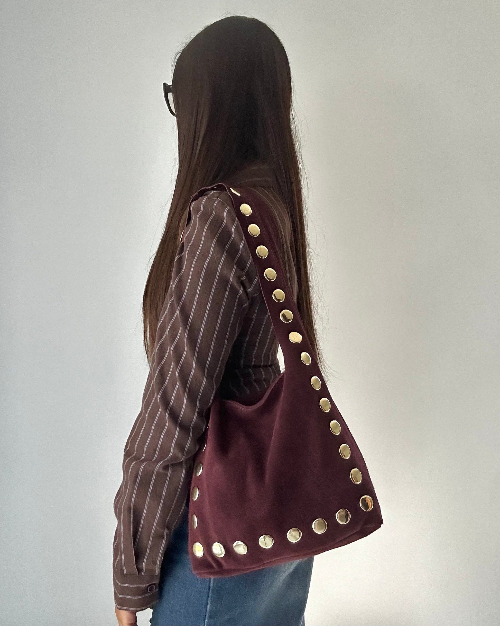 La Aurora Suede Bag è realizzata in vera pelle scamosciata Made in Italy, morbida al tatto e curata in ogni dettaglio. Le borchie dorate lungo il profilo illuminano la borsa, rendendola un pezzo unico da indossare sia di giorno che di sera.