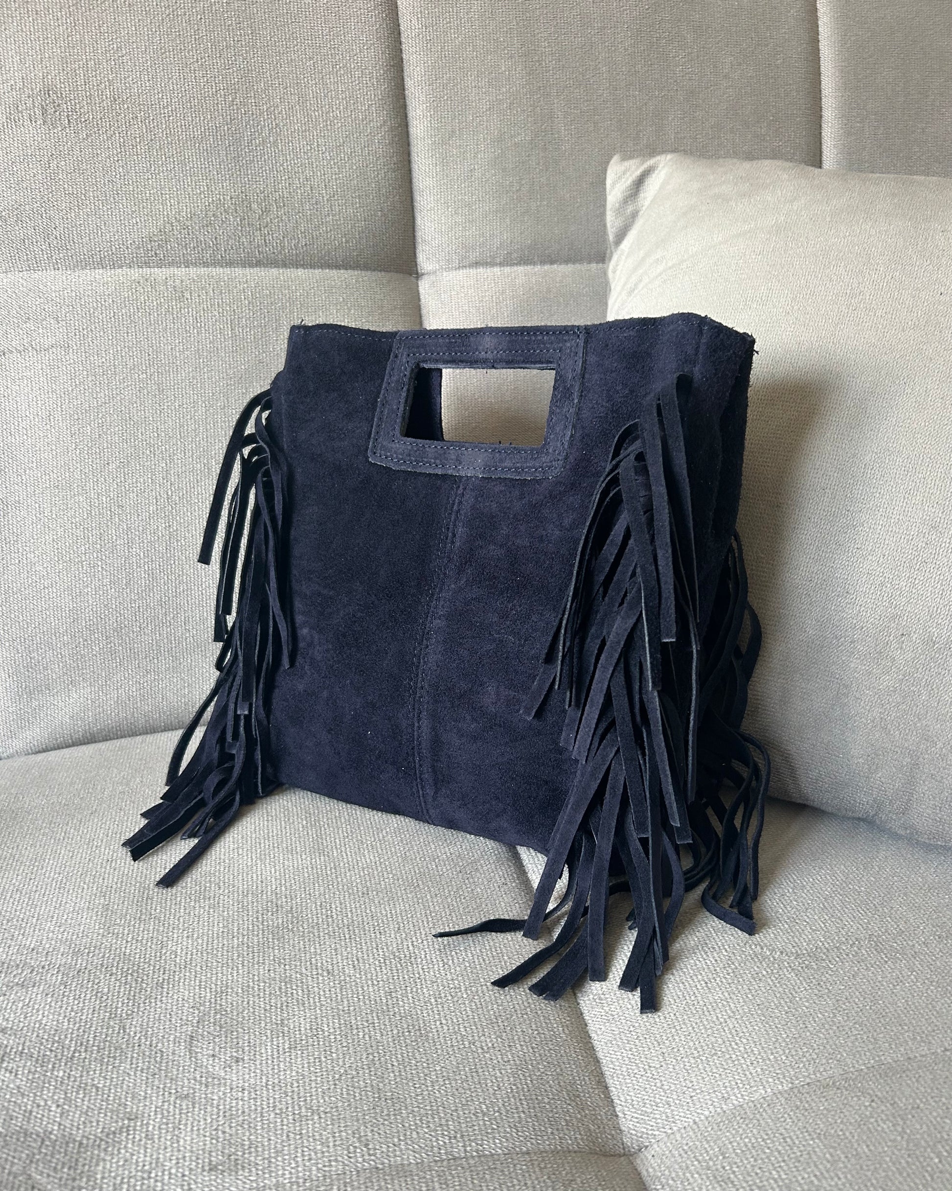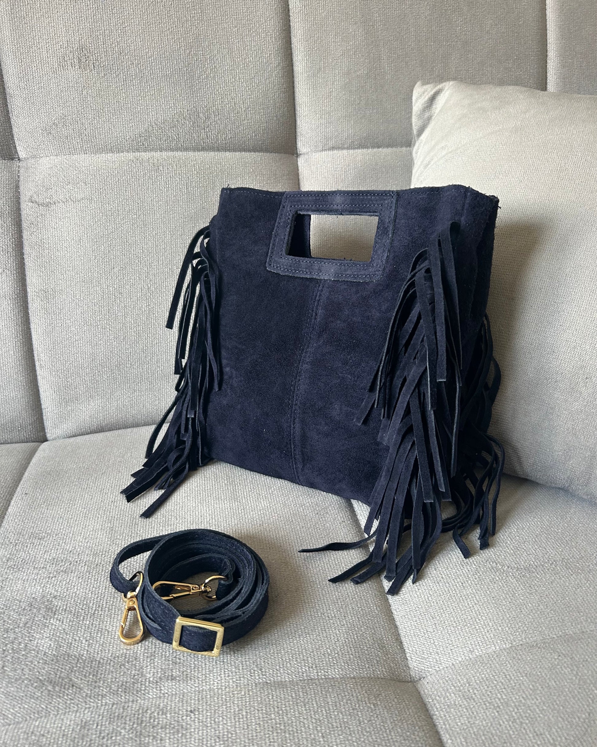 Realizzata in vera pelle scamosciata, unisce carattere e funzionalità. Le frange laterali donano un tocco boho-chic, mentre la tracolla regolabile garantisce comfort e versatilità. Capiente e pratica, è la compagna ideale per affrontare con stile ogni giornata, dal lavoro al tempo libero.