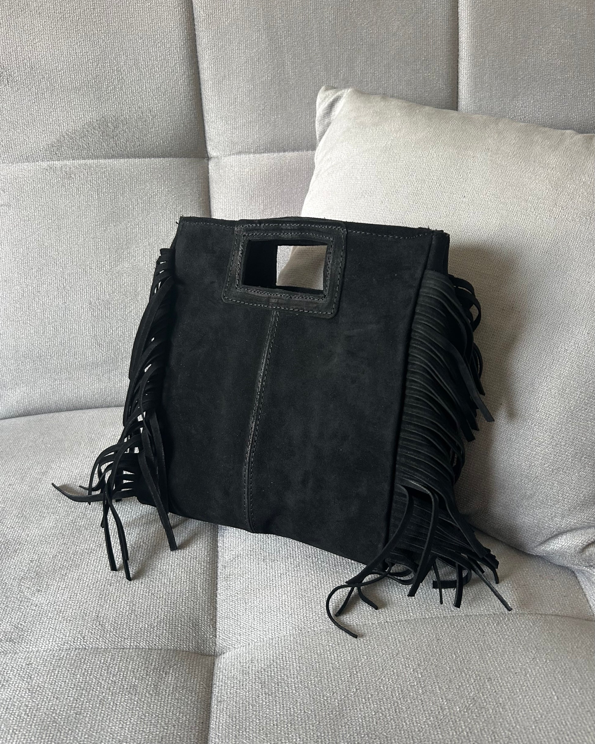Realizzata in vera pelle scamosciata, unisce carattere e funzionalità. Le frange laterali donano un tocco boho-chic, mentre la tracolla regolabile garantisce comfort e versatilità. Capiente e pratica, è la compagna ideale per affrontare con stile ogni giornata, dal lavoro al tempo libero.