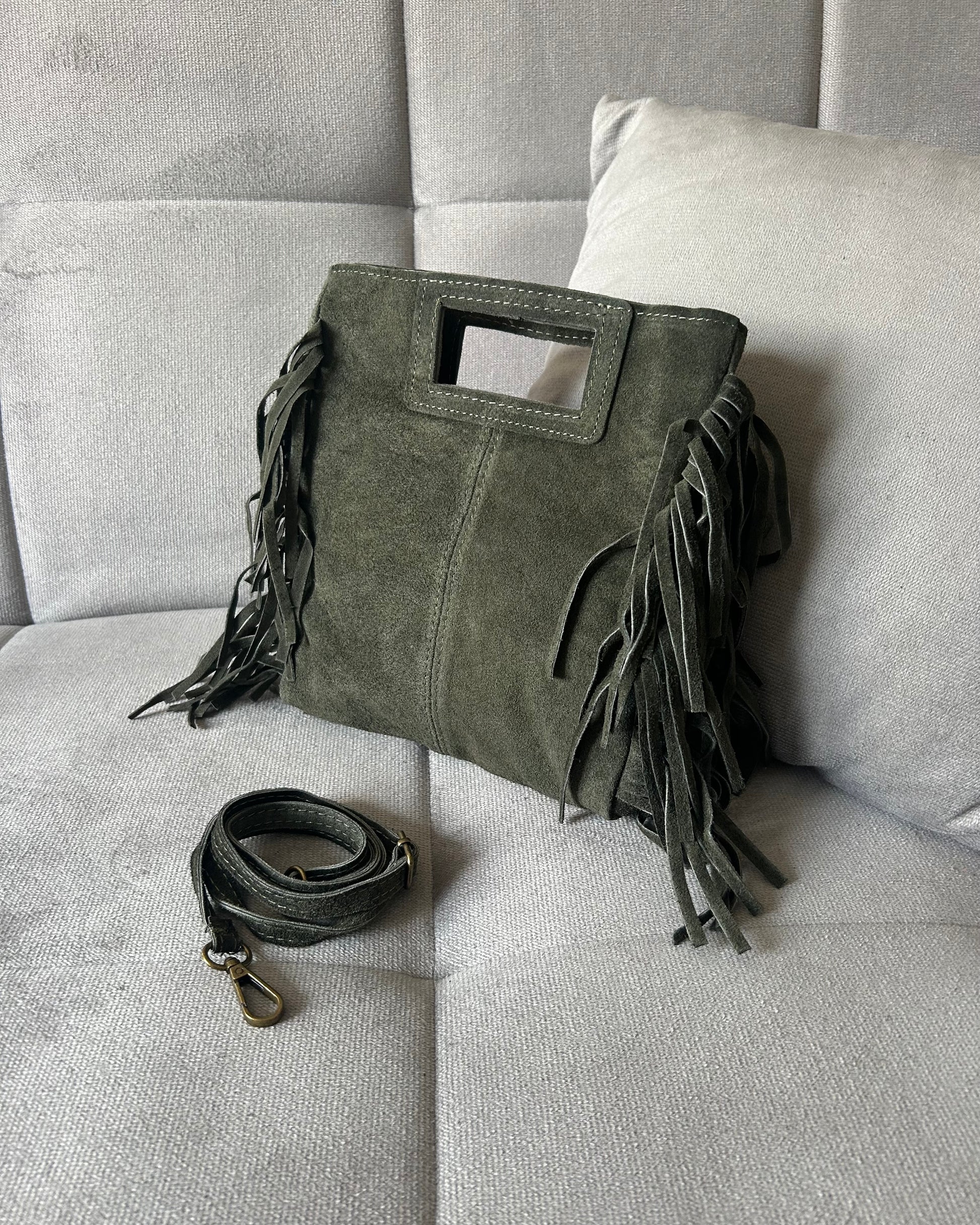 Realizzata in vera pelle scamosciata, unisce carattere e funzionalità. Le frange laterali donano un tocco boho-chic, mentre la tracolla regolabile garantisce comfort e versatilità. Capiente e pratica, è la compagna ideale per affrontare con stile ogni giornata, dal lavoro al tempo libero.